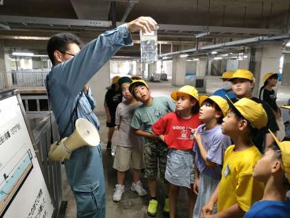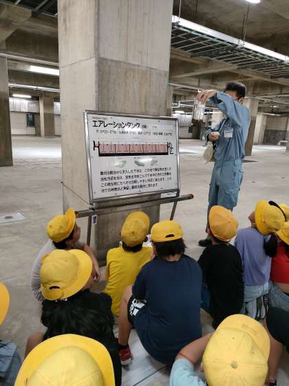 浄化センターに着き、見学しました。子供たちは、微生物が水をきれいにしていることを知り、驚いていました。ごみの処理にも、水の浄化にも、24時間体制で関わる方々がおられることも知りました。