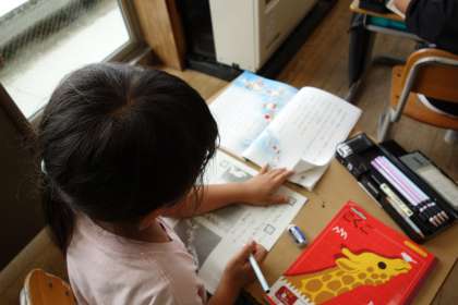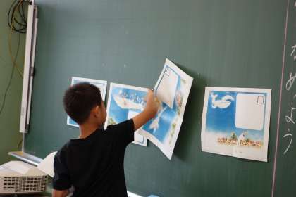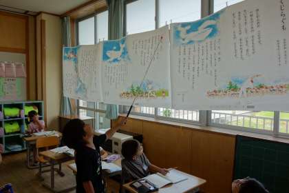 挿絵を並べ替えたり、短い言葉でまとめたりして、話の概要を捉えました。