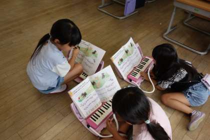 休み時間中にも鍵盤ハーモニカに取り組む子供たちの姿がよく見られます。楽しそうに演奏しています。
