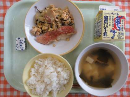 今日の献立は、ごはん、赤魚の塩焼き、卵とキクラゲの炒め物、みそ汁、ポケットチーズ、牛乳です。