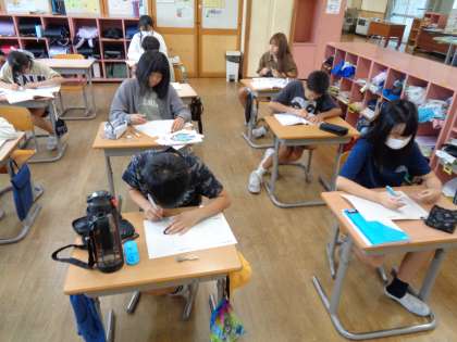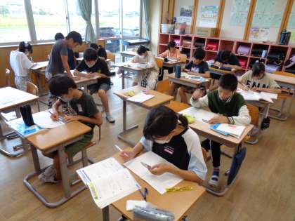 拡大図・縮図の学習に取り組んでいます。教科書問題やプリントを解きながら、理解を深めています。