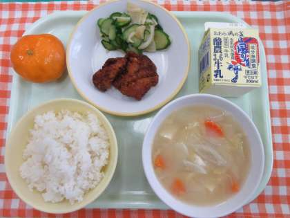 今日の献立は、ごはん、豚肉の竜田揚げ、かぶの色どり、呉汁、冷凍みかん、牛乳です。
