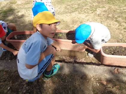 生活科の学習では、虫を捕まえる学習を行っています。生活科の時間だけでなく、休み時間にも進んでグラウンドに虫を捕まえに行く子供たちです。