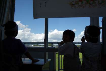 給食中に、子供がは空を眺めて話しかけてきました。国語科で行っている「くじらぐも」の学習から、空に関心をもった子供たちの姿が見られました。