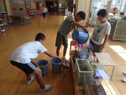 休み時間に、水替えを行っている児童がいました。仕事を分担し、協力しながら、作業を行っていました。