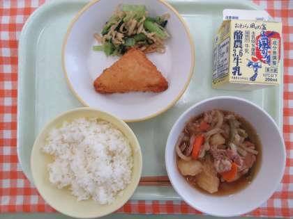 今日の献立は、ごはん、はんぺんフライ、はりはり和え、肉じゃが、牛乳です。