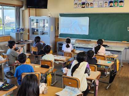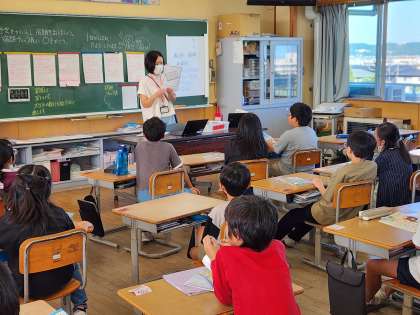今日の外国語活動は、1組と2組で同時に行いました。一方の教室の様子をもう一方の教室にオンラインで繋ぎ、一緒に学習しました。