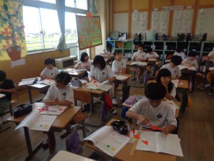正方形、長方形を斜めに切ってできた三角形の特徴について調べました。3つの角のうち、1つが直角だということに気付き、そのような三角形を、直角三角形ということを学びました。