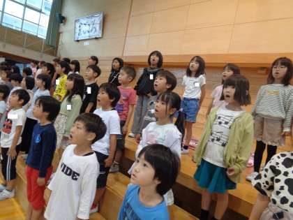 学習発表会の練習では、後ろの方まで聞こえるようにセリフを言うことや、口を大きく開けて歌を歌うこと等に気をつけて練習を行っています。毎日少しずつ成長する様子も見られていて、一人一人が本番を楽しみにしています。