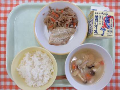 今日の献立は、ごはん、さばのしお焼き、きんぴら、五目みそ汁、牛乳です。