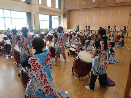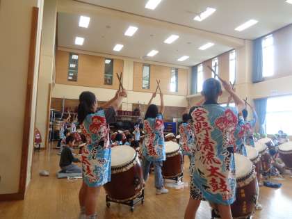 2回目の保育所交流を行いました。今日は、太鼓の演奏を披露しました。法被を着て、披露するのも初めてで、気持ちがこもっているのが伝わりました。保育園児も目を釘付けになっていました。