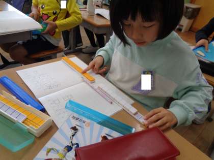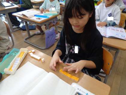3つの数の計算の学習では、算数ブロックを用いて、数が減ったり増えたりしていく様子を捉えています。