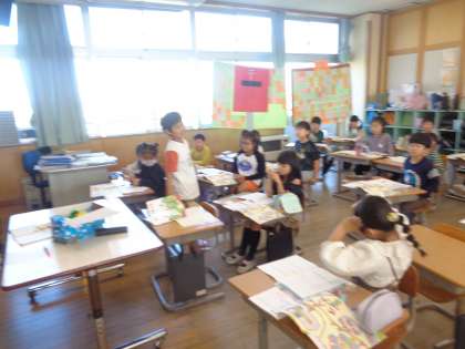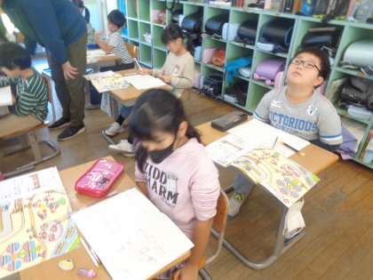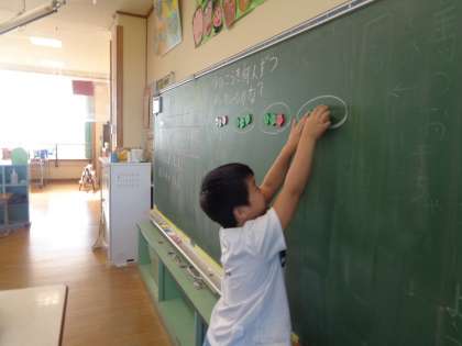 全ての人数を数えたい時の、簡単な数え方を考えました。子供たちは、おはじきを使ったり、絵で表したりして考えました。