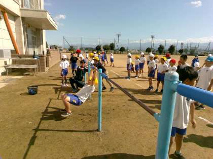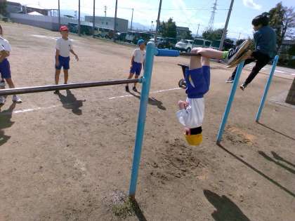 晴れは空の下、鉄棒を行いました。逆上がりができるように何回も鉄棒に向き合う姿が見られました。また、さらに難しい技にトライする姿がありました。