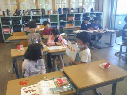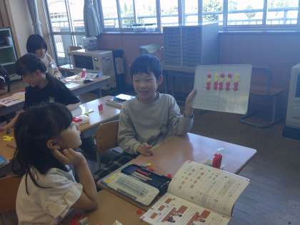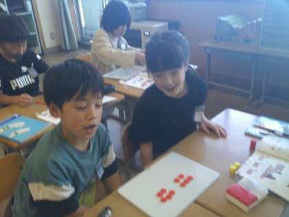 「ひとつ分の数」や「いくつ分」を意識しておはじきで表し、どんな式になるか問題を出し合いました。