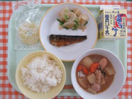 今日の献立は、ごはん、いわしの生姜味、かぶのいろどり、鶏肉と里芋のごま煮、冷凍パイン、牛乳です。