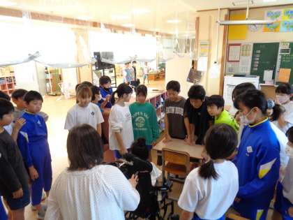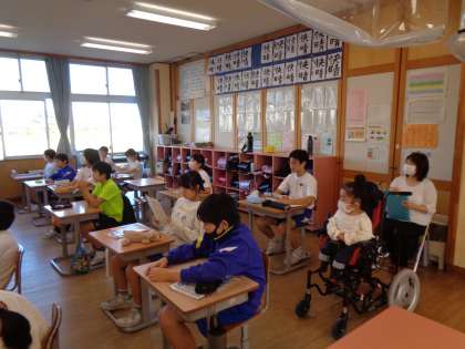 「居住地交流」とは、地域に住んでいて特別支援学校に通っている友達と交流学習を行うという取組です。今日は一緒に、外国語の学習をしました。カードゲームを通して、動物が住んでいる場所を英語で話す練習をしました。楽しく活動することができました。