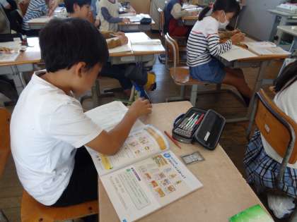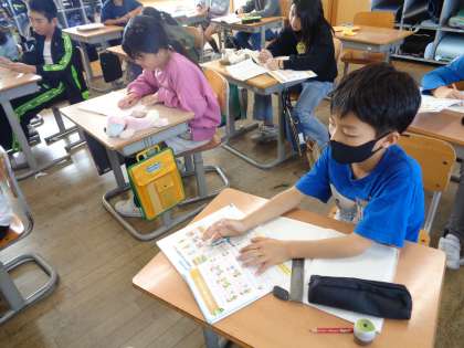 今までは2つの式で表したり引き算だけを使ったりしていましたが、今日は( )を使った式を学習し、( )を使って1つの式でおつりを求めました。