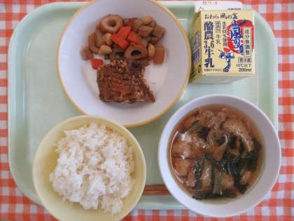 今日の献立は、ごはん、魚のあまみそかけ、五目煮豆、うすくず汁、牛乳です。