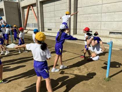 鉄棒運動も大詰め、友達に発表する技を決め、練習する姿が見られました。