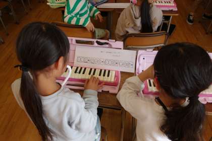 音楽科の学習の様子です。ルールを守って、旋律づくりにチャレンジ。実際に鍵盤ハーモニカで演奏してみました。