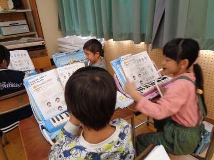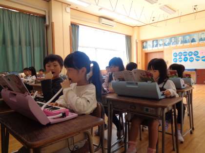 音楽の学習では、歌を歌ったり、鍵盤ハーモニカを使って演奏したりしています。鍵盤ハーモニカを使った学習では、3つの音をつかってリズムをつくり、お友達と聴き合いました。