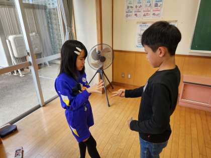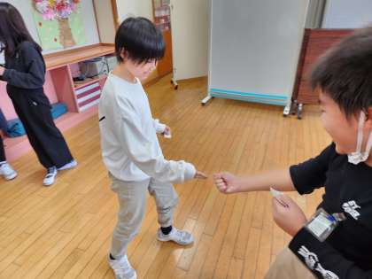 自分と同じアルファベットのカードを持っている人を見付けて、じゃんけんをします。勝つと、相手が持っているカードを全て受け取ることができます。学年全員でじゃんけんを楽しみました。