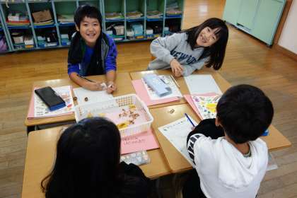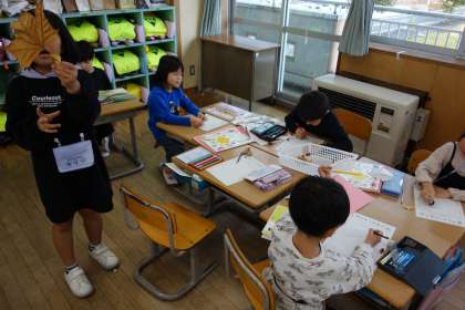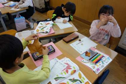 前回に引き続き、秋みつけの学習です。グラウンドにはない葉っぱやどんぐりをじっくりと観察しました。いろいろな発見があったようです。