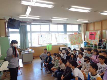 今日は、富山市婦中図書館の方に来ていただき、服をテーマにした本を6冊、読み聞かせをしていただきました。本に興味をもつだけではなく、図書館の方の読み方の工夫は何かを探しながら聴いていました。自分たちが音読劇をする「お手紙」に生かそうとしていました。