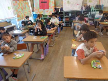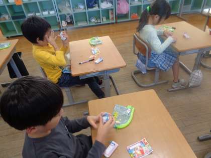 朝学習の時間に、かけ算を正確にするために九九を覚えています。九九カードを使いながら、今まで勉強した九九だけでなく、まだ授業で習っていない九九にも挑戦する姿が見られます。