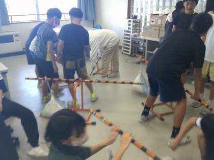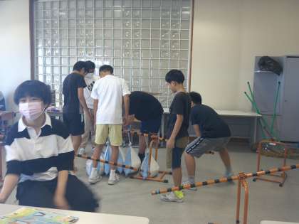 「てこのはたらき」の学習。砂の袋を棒につるして、手応えの変化を確かめました。