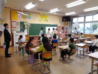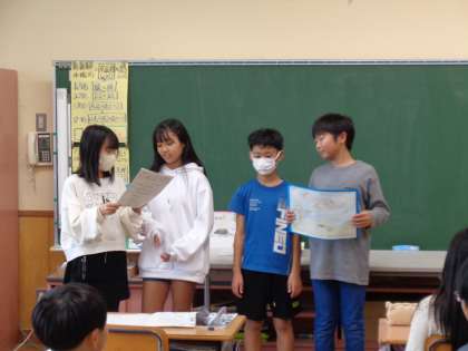 食物連鎖の関係を英語で発表しました。自分たちが選んだ動物が住んでいる場所や食べるものを、グループで分担して友達に伝えることができました。