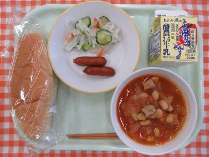今日の献立は、コッペパン、あらびきウインナー、大根サラダ、ポークビーンズ、牛乳です。