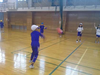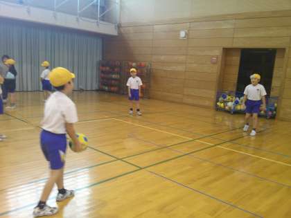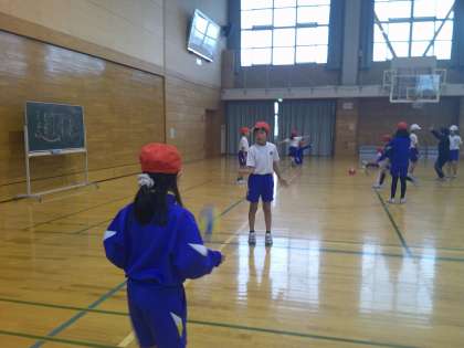 体育科の学習で、「プレルボール」を行っています。仲間同士でバウンドして打ち返すネット型の運動です。今日は、グループで円になって練習を進めました。試合ができるのを楽しみにしている子供たちです。