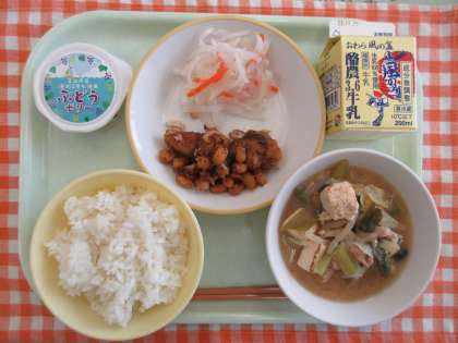 今日の献立は、ごはん、魚と大豆のえごまからめ、おすわい、富山のみそ野菜鍋、海洋深層水ゼリー、牛乳です。