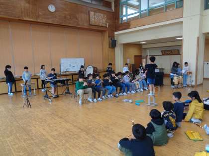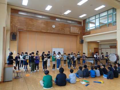 合奏の発表会を行い、1組は「茶色の小びん」を、2組は「小さな世界」を演奏しました。