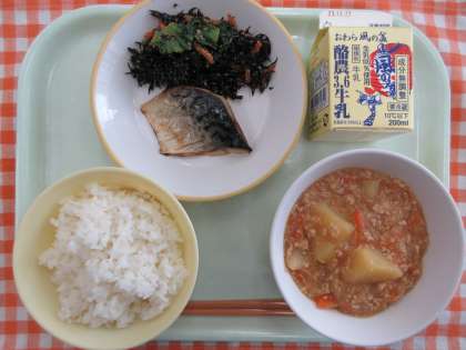 今日の献立は、ごはん、さばの塩焼き、ひじきのごま和え、ジャガイモのそぼろ煮、牛乳です。