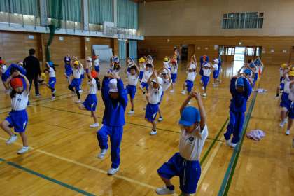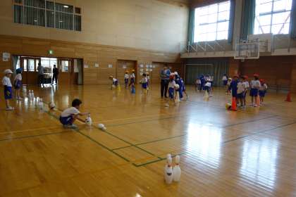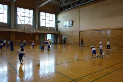 体育科の学習の様子です。前回の「投げる」に変わって「蹴る」遊びです。ポイントをよく聞き、目標に向かって何度もトライしました。