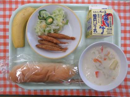 今日の献立は、米粉コッペパン、わかさぎのフリッター、コールスローサラダ、クラムチャウダー、バナナ、牛乳です。
