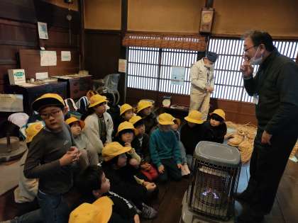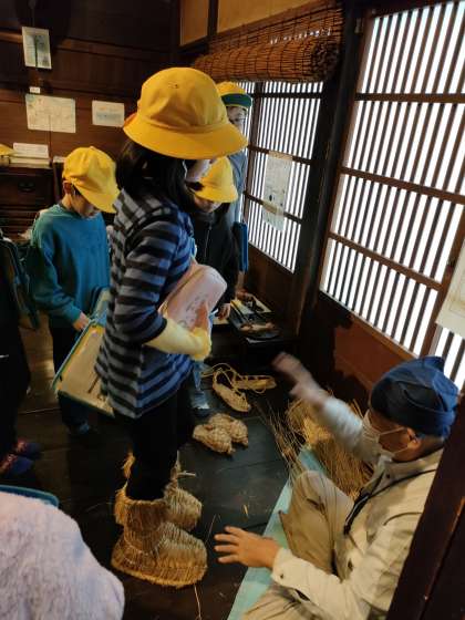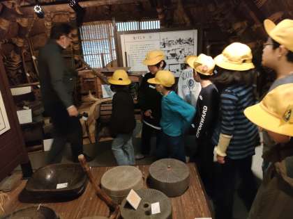 民俗資料館では、富山市の移り変わりのお話を聞いたり、昔の道具を見学したりしました。子供たちは、昔の電話やミシン、炊飯器、わら靴等を見せてもらい、今との大きな違いに驚いていました。