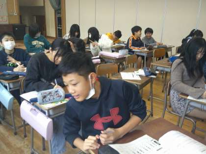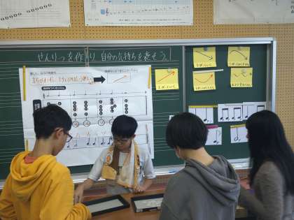 「旋律を作って、自分の気持ちを表そう」と、自分で考えたり、友達と話したりしながら学習を進めました。音とリズムを決めることができ、次回が楽しみです。