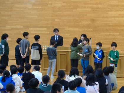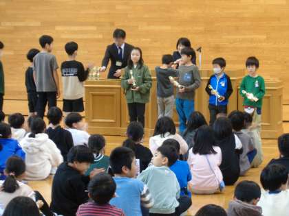 4年生は2クラス揃って、10月の宮野っ子検定トライアングル賞を受賞しました。今月も頑張ろう!