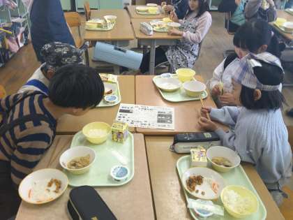 11月は富山県食育推進月間です。富山でとれた米や魚、肉、野菜、果物などをたくさん取り入れた献立を実施しています。学校では、富山県の各市町村で穫れた食材に色を塗り、地産地消のよさを学ぶ活動をしています。給食委員会の児童が中心となって活動しています。