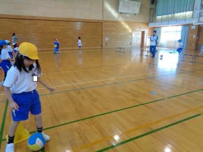体育の学習では、ボールを使った学習に取り組んでいます。ゴールにあるハードルの中にボールを入れるにはどのように蹴ればいいのか、考えて学習に取り組む姿も見られました。
