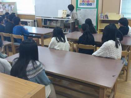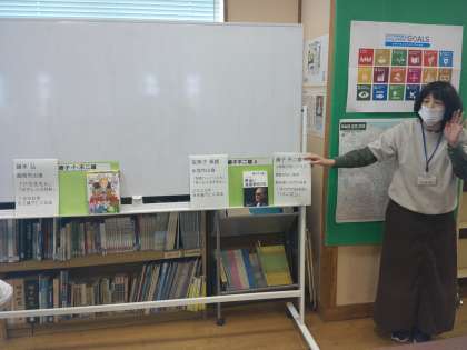 図書室でブックトーク。富山にちなんだ本や作家等について学びました。