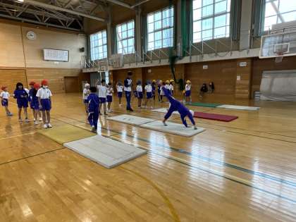 先週教えていただいたことをもとに側転や開脚前転などのマットの練習を頑張っています。