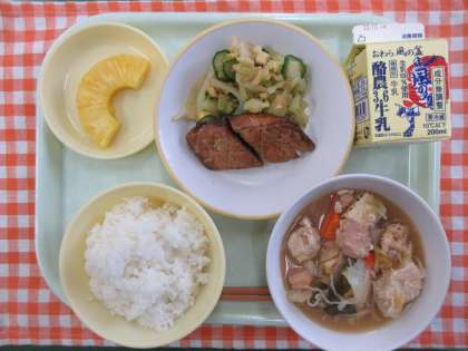 今日の献立は、ごはん、あじのみりん焼き、コーン和え、鶏すき焼き、パイナップル、牛乳です。