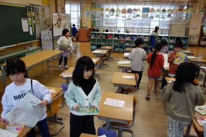 掃除が終わり、戻ってきた子供たちから進んで配り物の仕事をしています。特に役割が決まっていなくとも、仕事を見付けて働く子供たちが多いです。素敵です。