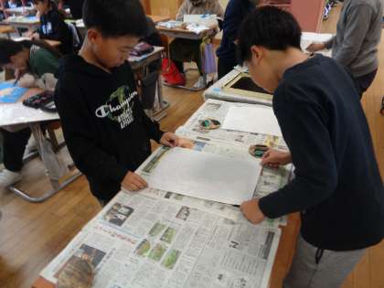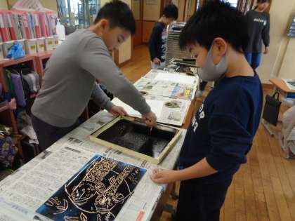 版画の印刷をしている様子です。友達と協力しながら、作業を効率的に進めていました。