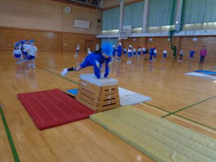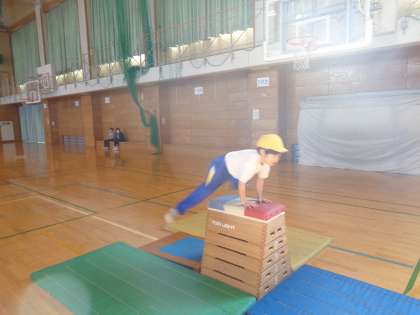 今日から、跳び箱の学習に入りました。手を遠くに着いたり、両足で跳んだりすることが大切だということに気付き、一生懸命に学習に取り組みました。